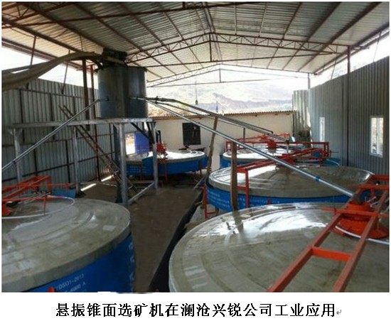 懸振錐面選礦機(jī)”是依據(jù)拜格諾剪切松散理論和流膜選礦原理研制而成的新型微細(xì)粒重選設(shè)備。當(dāng)攪拌均勻的礦漿從分選錐面的給礦器進(jìn)入盤(pán)面初選區(qū)時(shí),礦漿流即成扇形鋪展開(kāi)向周邊流動(dòng),在其流動(dòng)過(guò)程中流膜由厚逐漸變薄,流速也隨之逐漸降低。